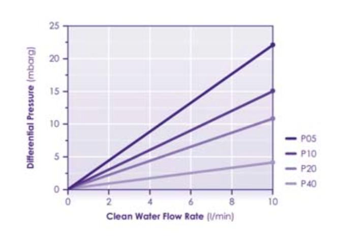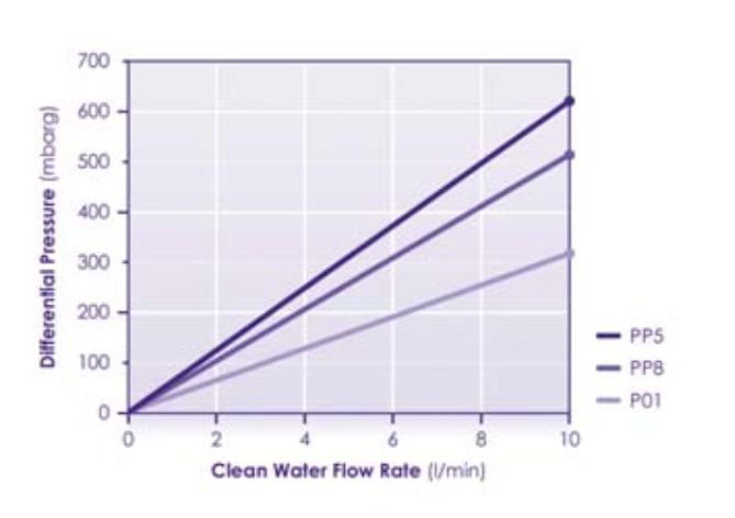 A 136mm (5”) Polyfil™ Junior cartridge exhibits the flow-ΔP characteristics indicated below, for solutions with a viscosity of 1 centipoise.